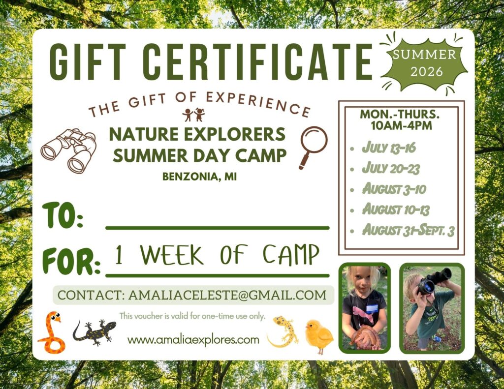 ANNOUNCING: Nature Explorers 2025 Summer Day Camps! All camps are held from 10am-4pm, Monday through Thursday.Cost: $240 per weekDay Rate: $6010% sibling discount Nature Explorers programming is held in the village of Benzonia, on ⅔ of an acre just off US 31. Participants spend time in the indoor and outdoor classroom spaces and wooded area. …